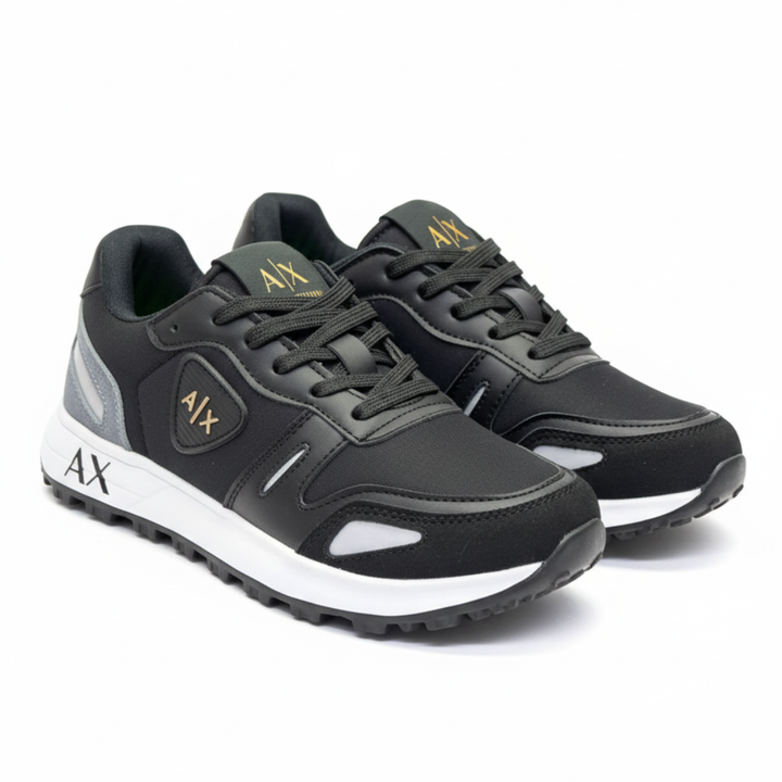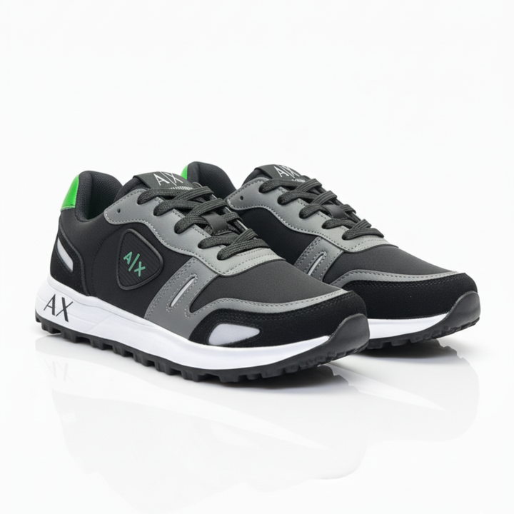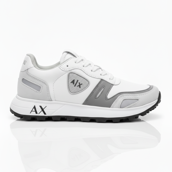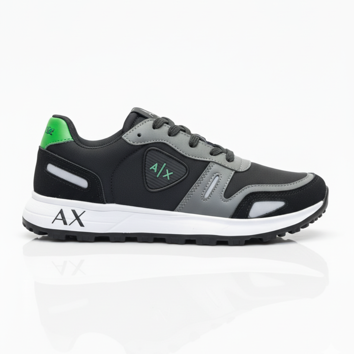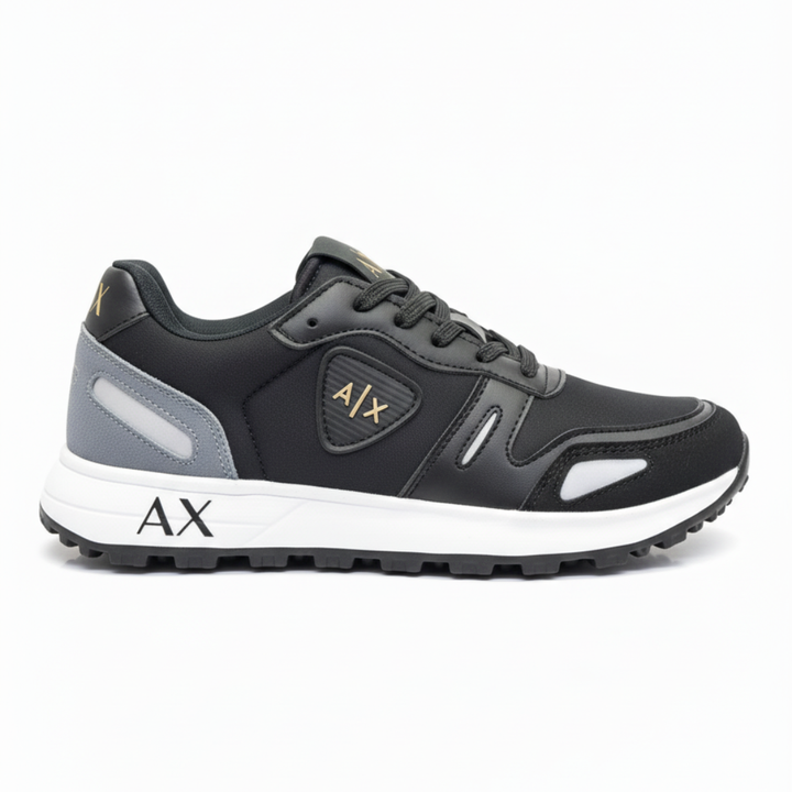 Su estructura ergonómica y capellada texturizada ofrece un ajuste firme y seguro, mientras que los detalles metálicos en el logo A|X aportan un look sofisticado que se adapta tanto a entornos casuales como de trabajo.